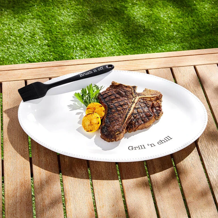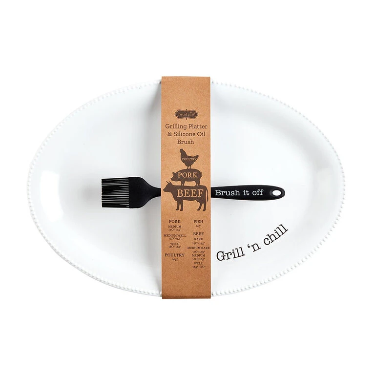Chill out with the grill out and get inspired to fire things up when you pull out this ceramic serving platter with coordinating silicone basting brush. Mud Pie ceramic grill platter and brush both feature punny messages to keep the party going. Perfect for piling on poultry, pork or beef, this 2-piece set makes a great gift for the barbecue lover in your life!
